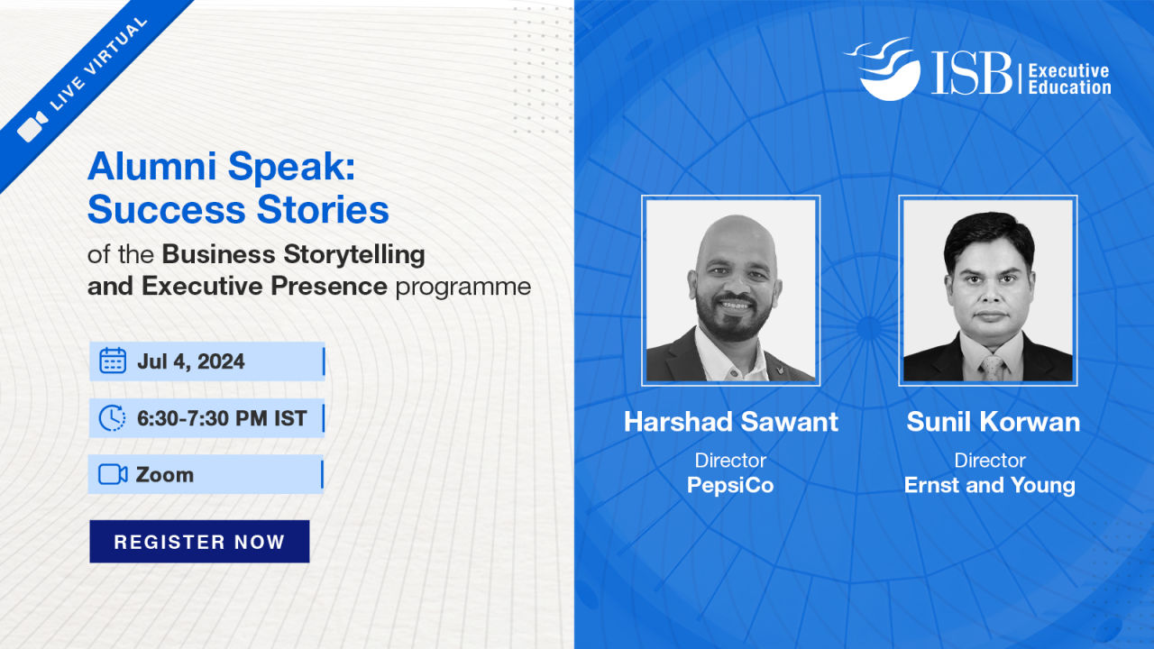 We invite you to join the webinar on Alumni Speak: Success Stories of the ‘Business Storytelling and Executive Presence' (BSEP) featuring its alumni from PepsiCo, and Ernst and Young.