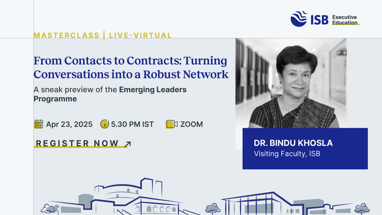 In a landscape where leadership is increasingly defined by relational capital, the ability to foster strategic, trust-based connections has become a critical differentiator. Join us for a MasterClass, “From Contacts to Contracts: Turning Conversations into a Robust Network” led by Dr. Bindu Khosla, Visiting Faculty, ISB, on Apr 23, 2025, at 5:30 PM IST on Zoom, as she delves into the art and science of building a powerful professional network that drives influence, credibility, and results.