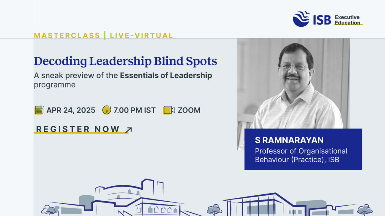 Join S Ramnarayan, Professor of Organisational Behaviour (Practice), ISB, as he unpacks the subtle but significant impact of leadership misses in a MasterClass on “Decoding Leadership Blind Spots” on Apr 24, 2025, at 7:00 PM IST on Zoom. It will explore how these unseen pitfalls manifest in real-world contexts and what it takes to recognise and overcome them.