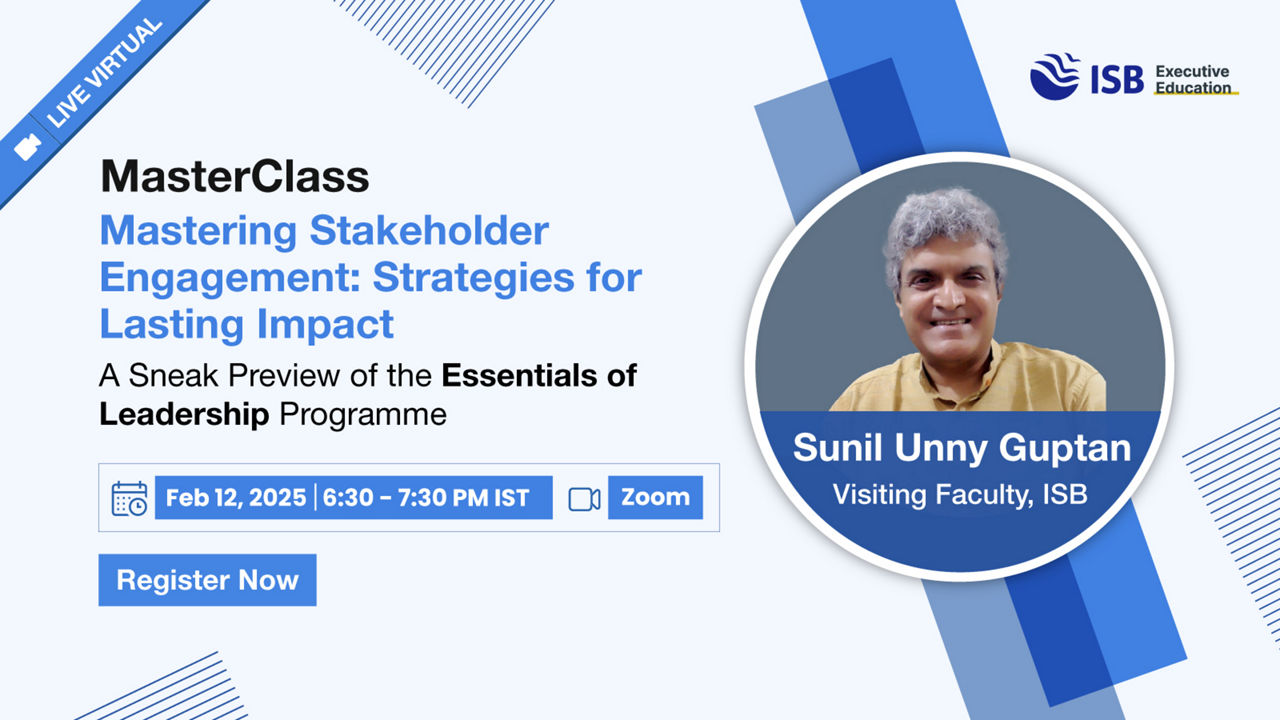 Join us for a MasterClass on ‘Mastering Stakeholder Engagement: Strategies for Lasting Impact’ on Feb 12, 2025, at 6:30 PM IST on Zoom, led by Sunil Unny Guptan, Visiting Faculty at ISB, where you will gain practical strategies to enhance influence, build trust, and create lasting impact.