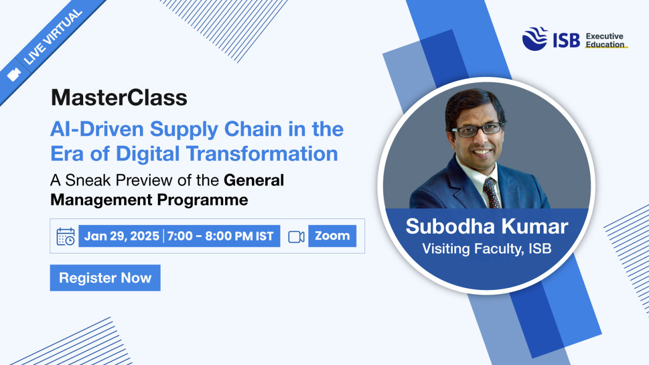 In the rapidly evolving digital landscape, the integration of Artificial Intelligence (AI) in supply chain management is a game-changer. Join us for a MasterClass on ‘AI-Driven Supply Chain in the Era of Digital Transformation’ on Jan 29, 2025, at 7:00 PM, on Zoom, led by Subodha Kumar, Visiting Faculty, ISB and explore the profound impact of AI-driven technologies on modern supply chains.