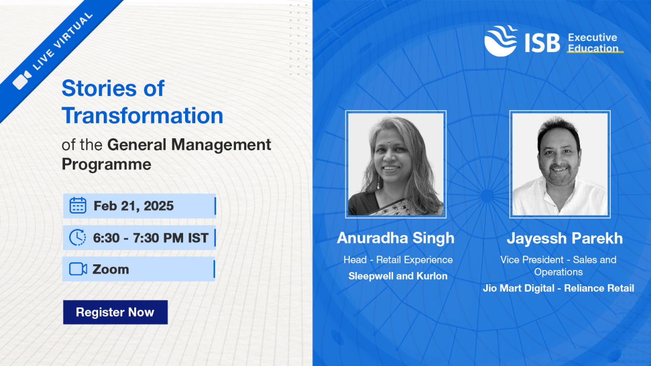 We invite you to join the webinar on Stories of Transformation of the ‘General Management Programme’ featuring its alumni Anuradha Singh, Head - Retail Experience, Sleepwell and Kurlon, and Jayesh Parekh, Vice President - Sales and Operations, Jio Mart Digital - Reliance Retail.