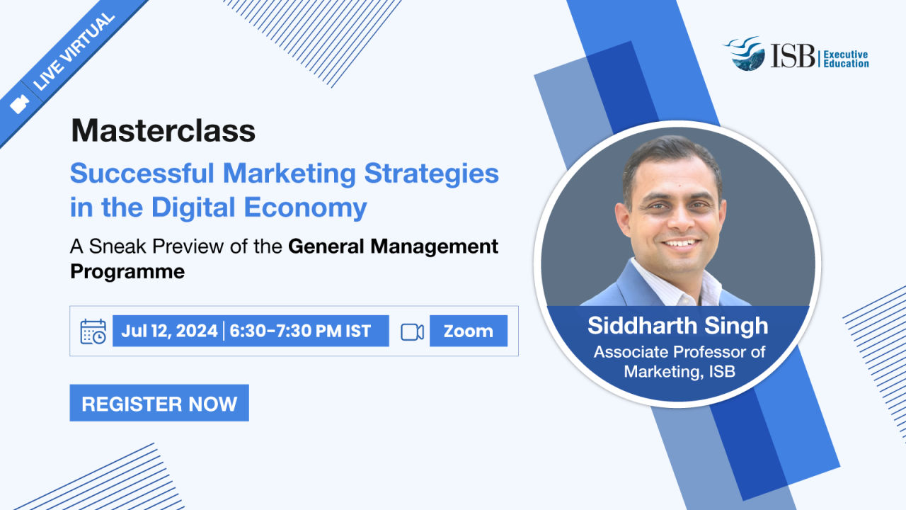 Join us for a Masterclass on "𝐒𝐮𝐜𝐜𝐞𝐬𝐬𝐟𝐮𝐥 𝐌𝐚𝐫𝐤𝐞𝐭𝐢𝐧𝐠 𝐒𝐭𝐫𝐚𝐭𝐞𝐠𝐢𝐞𝐬 𝐢𝐧 𝐭𝐡𝐞 𝐃𝐢𝐠𝐢𝐭𝐚𝐥 𝐄𝐜𝐨𝐧𝐨𝐦𝐲," led by Siddharth Singh, Associate Professor of Marketing, ISB, on July 12, 2024, at 6:30 PM IST on Zoom, and explore the power of marketing and its impact on consumer behaviour, market dynamics, and business outcomes in the digital economy.