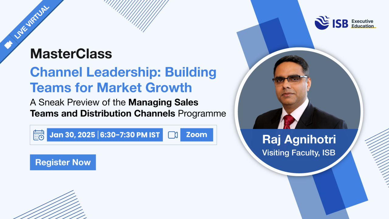 Channel leadership stands as a cornerstone of successful market expansion in today’s competitive and volatile market. Join us for an exclusive MasterClass on “Channel Leadership: Building Teams for Market Growth” on Jan 30, 2025, at 6:30 PM IST on Zoom, led by Raj Agnihotri, Visiting Faculty at ISB, as he unravels the art and science of building high-performing sales teams and distribution networks.
