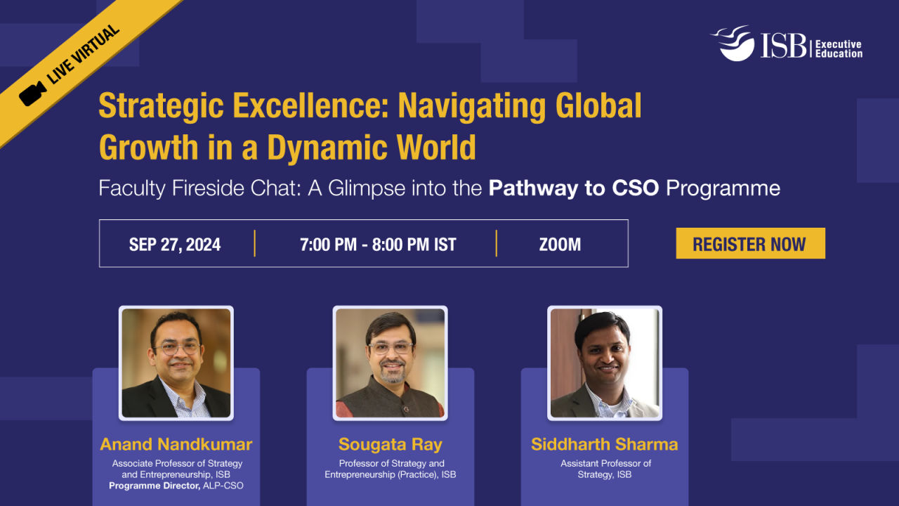 The discussion will be led by Anand Nandkumar, Associate Professor of Strategy and Entrepreneurship, ISB and Programme Director ALP-CSO, Sougata Ray, Professor of Strategy and Entrepreneurship (Practice), ISB, and Siddharth Sharma, Assistant Professor of Strategy, ISB, and will delve into key areas such as international market expansion, risk management, innovation, and the role of strategic transformation in achieving sustainable growth.