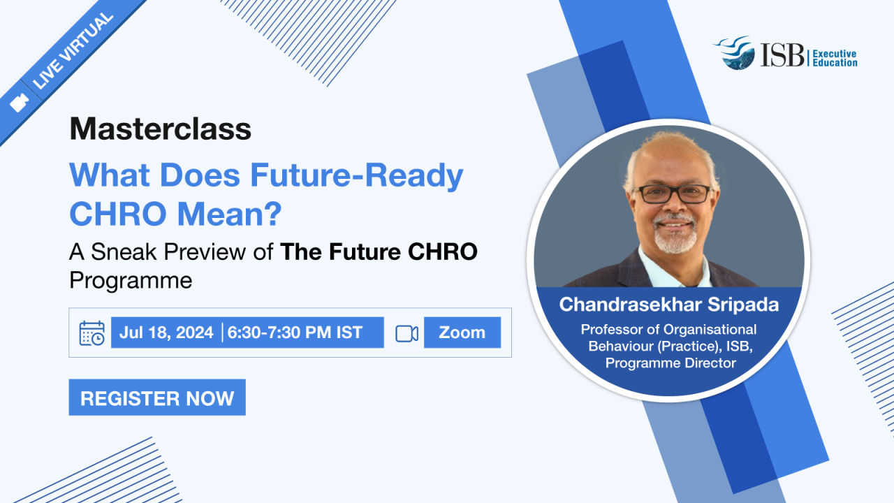 Join us for an exclusive Masterclass on 𝐖𝐡𝐚𝐭 𝐃𝐨𝐞𝐬 𝐅𝐮𝐭𝐮𝐫𝐞-𝐑𝐞𝐚𝐝𝐲 𝐂𝐇𝐑𝐎 𝐌𝐞𝐚𝐧?’ on July 18, 2024, at 6:30 PM IST, on Zoom, led by Chandrasekhar Sripada, Professor of Organisational Behaviour (Practice), ISB; Programme Director – The Future CHRO. This session will delve into the transformative qualities and skills that define a future-ready CHRO, providing an insightful preview of the comprehensive The Future CHRO programme.