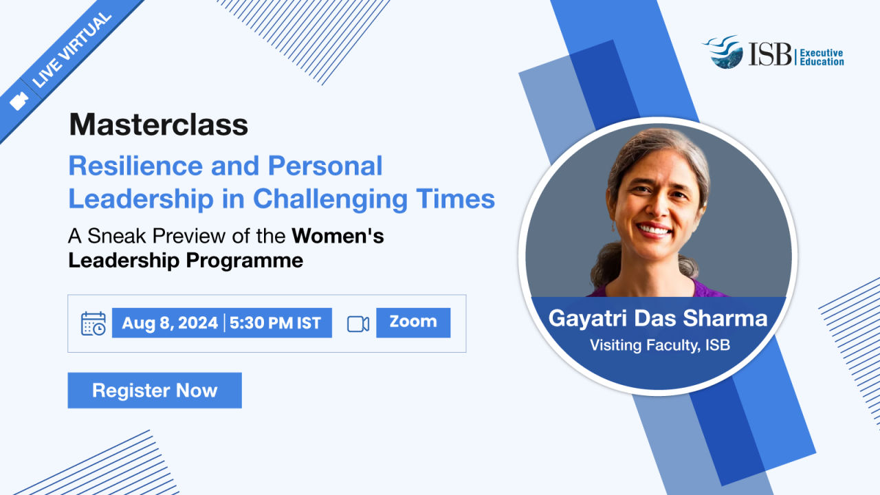 We invite you to a Masterclass led by Gayatri Das Sharma, Visiting Faculty, ISB, on "Resilience and Personal Leadership in Challenging Times" on Aug 8, 2024, at 5:30 PM IST on Zoom and get a sneak preview of the Women’s Leadership Programme as she shares insights on how to cultivate a resilient mindset, develop adaptive strategies, and inspire teams through effective personal leadership.