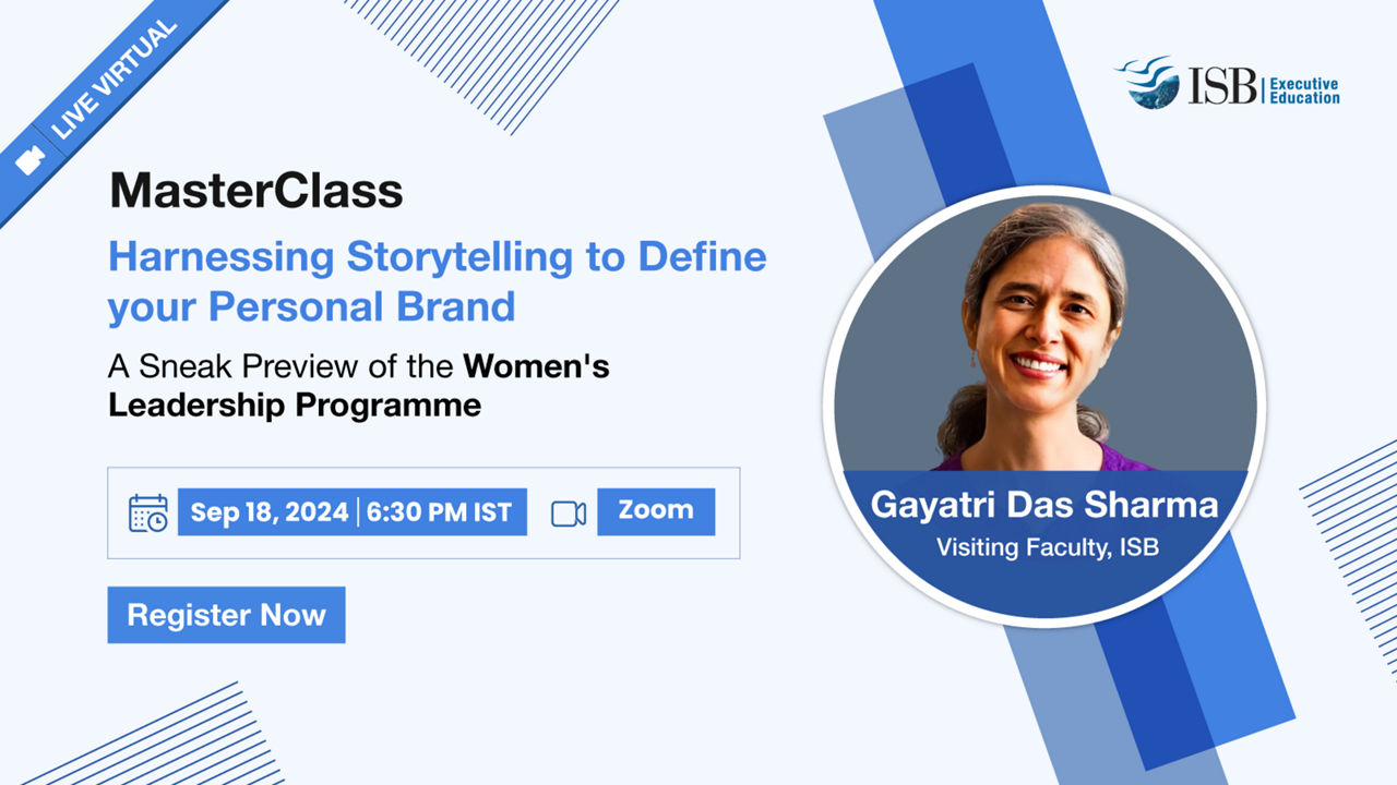 Join us for a MasterClass led by Gayatri Das Sharma, Visiting Faculty, ISB, on ‘Harnessing Storytelling to Define your Personal Brand’ scheduled on Sep 18, 2024, at 6:30 PM on Zoom and dive deep into the art of storytelling as a pivotal aspect of personal branding.